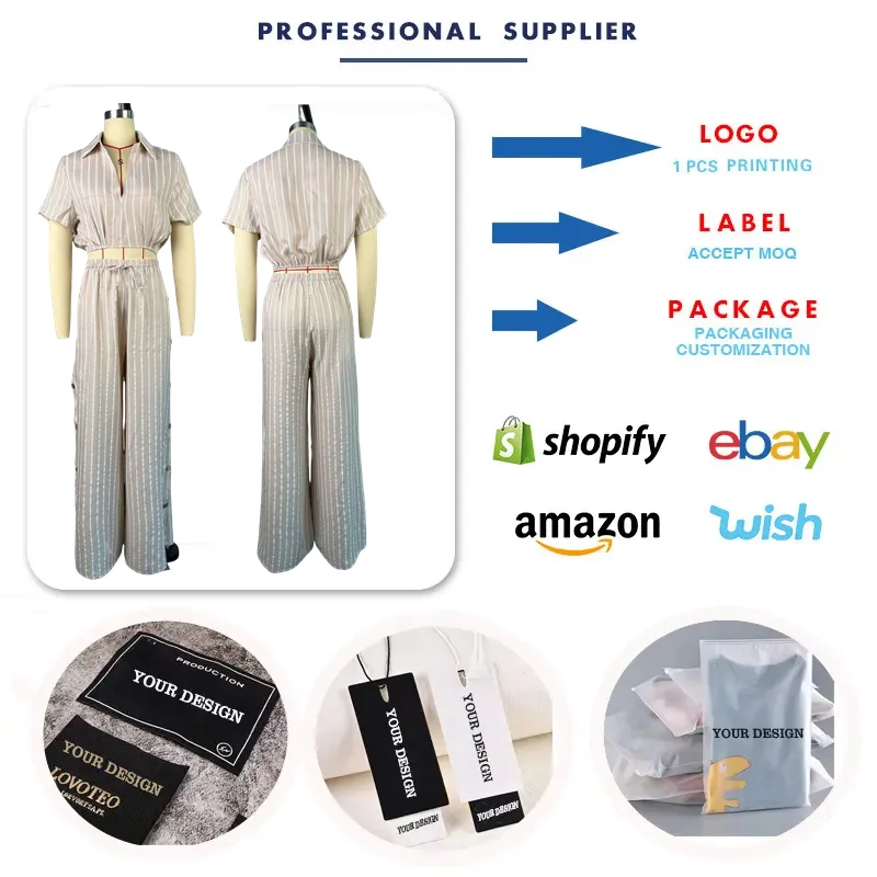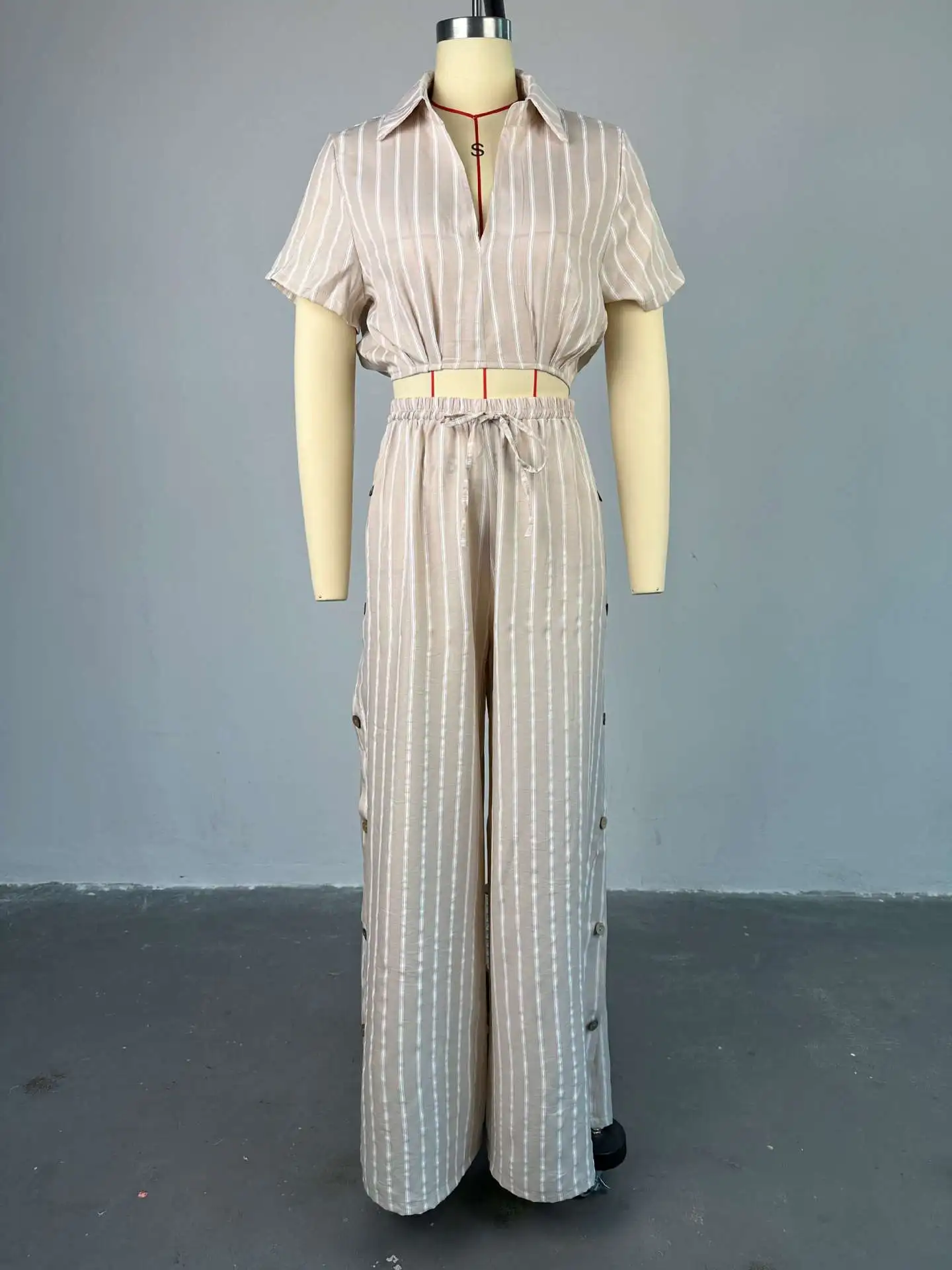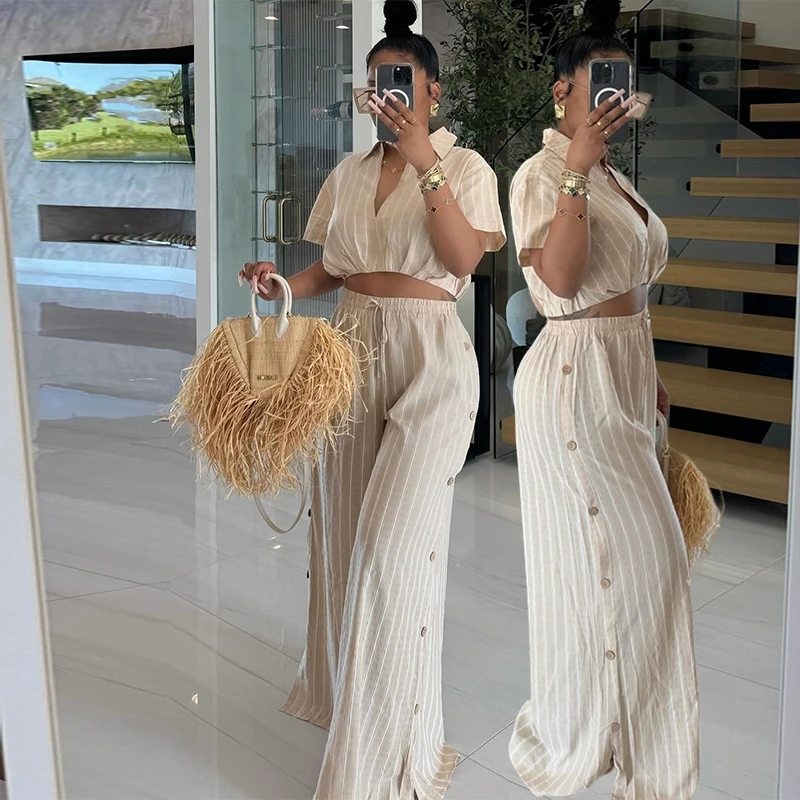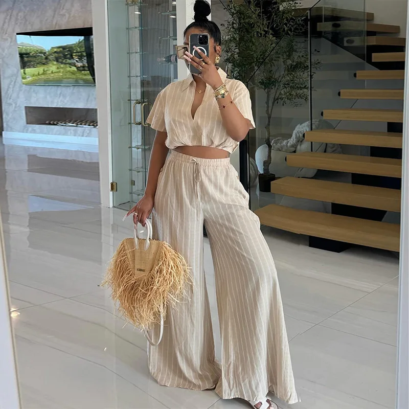 HK7590 Trendy Two Piece Pants Set Strip Short Sleeve Shirt and High Waist Drawstring Wide Leg Pants Set Summer Outfits for Women
